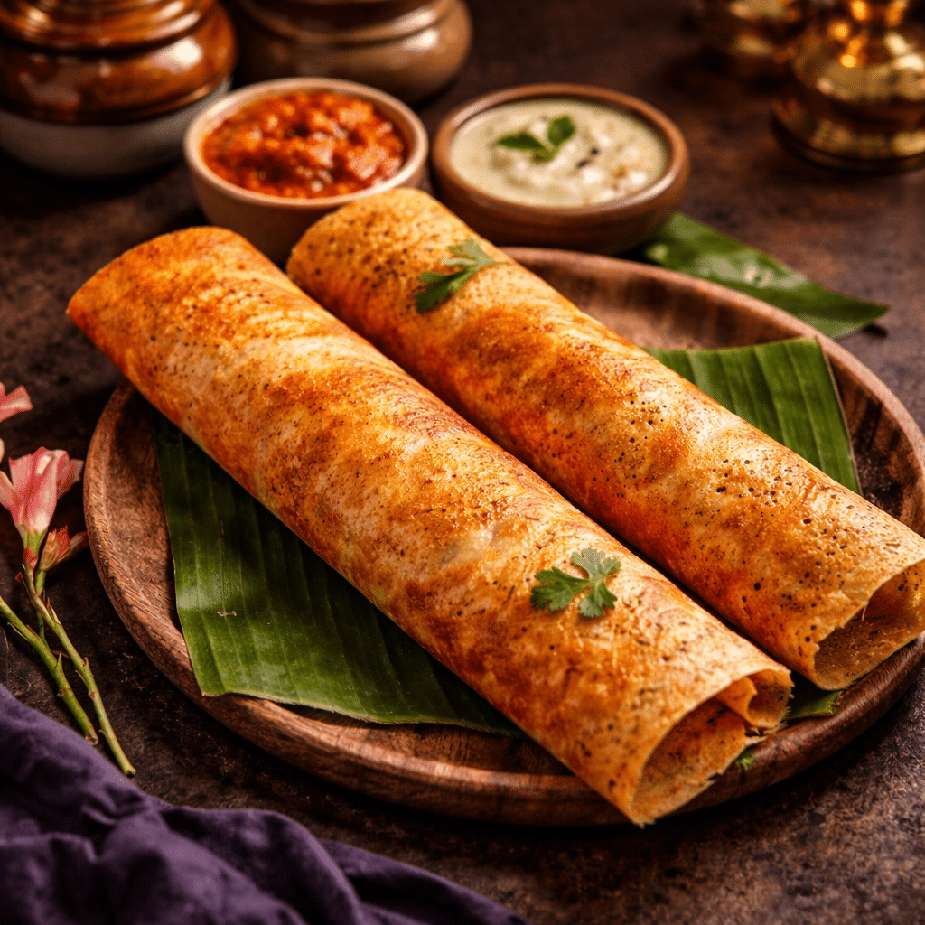 A well-prepared dosa, served with sambar and chutneys, offers: